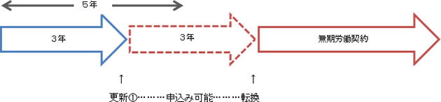 *3年契約の場合は,1回目の更新が成立した時点で,通算5年を超える労働契約が成立するため,労働者は無期転換を申し込むことができる。